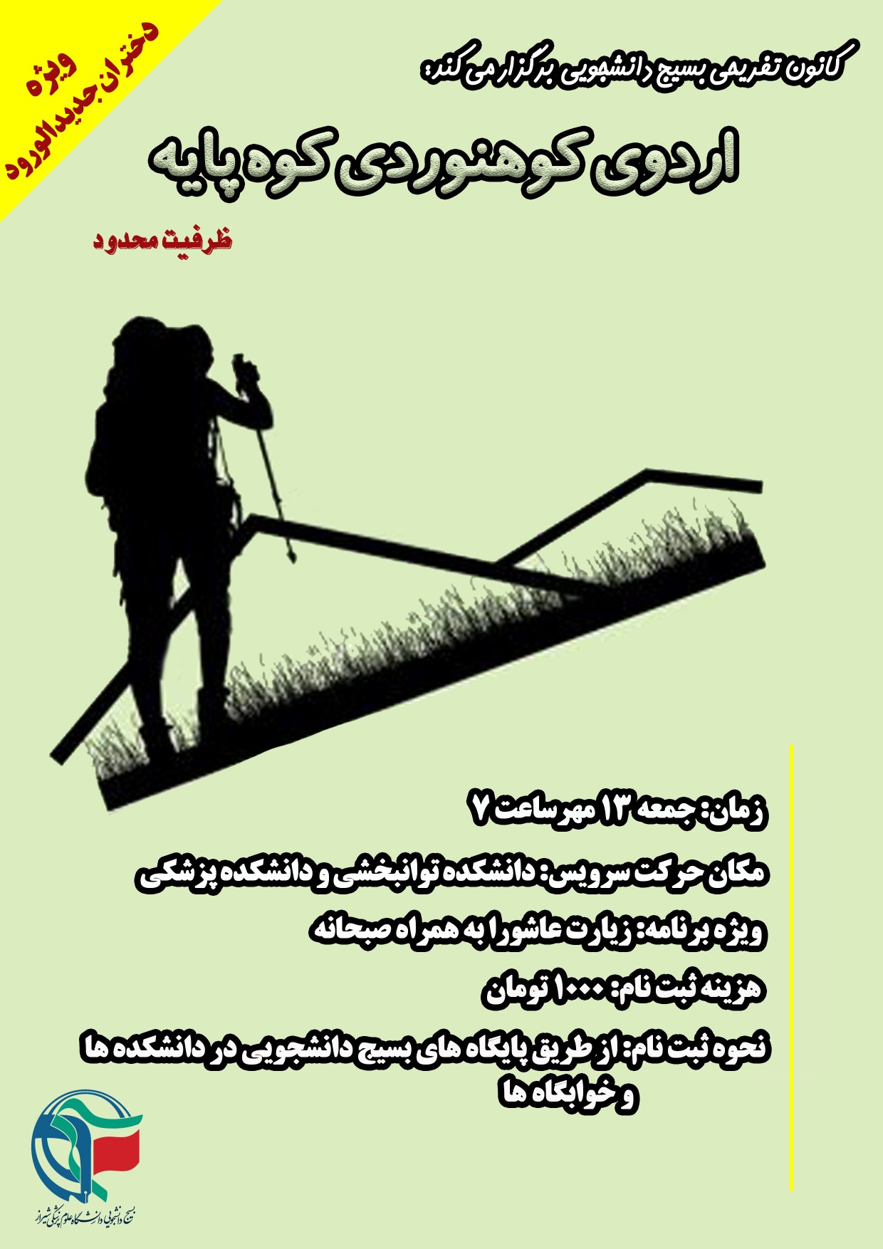 به گزارش کانون خبر بسیج دانشجویی علوم پزشکی شیراز، مسئول کانون تفریحات بسیج دانشجویی از برگزاری اردوی کوهنوردی کوهپایه ویژه دانشجویان دختر جدیدالورود در روز جمعه مورخ ۱۳مهر خبر داد.